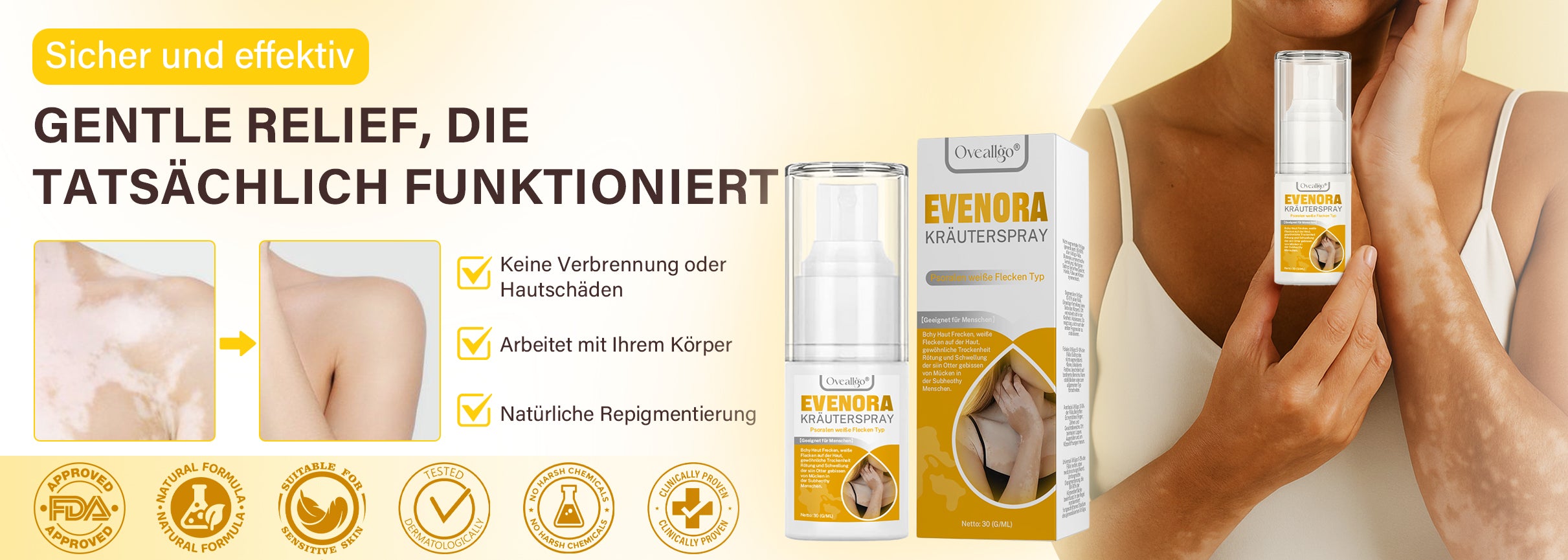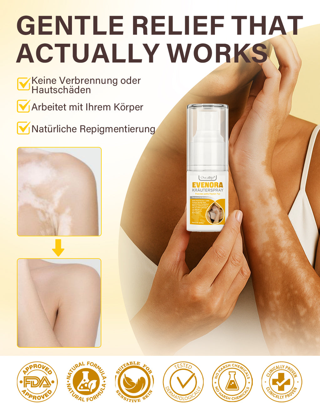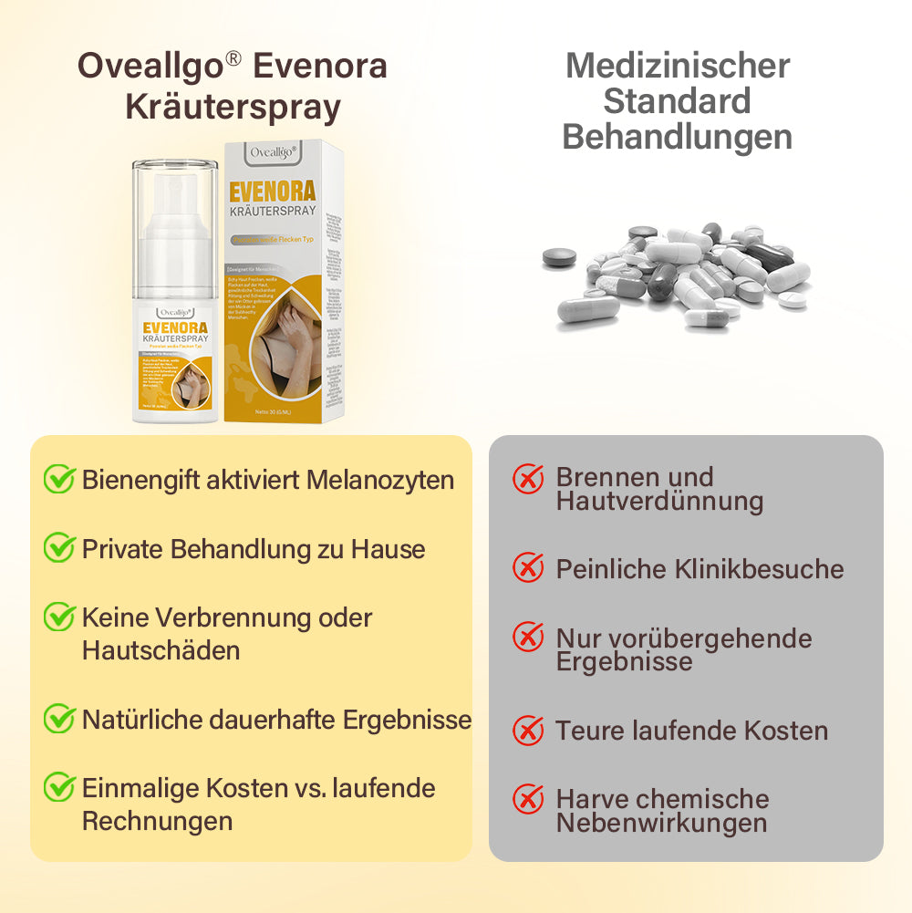 Oveallgo® Evenora Herbal Spray liefert sichtbare Ergebnisse bei der Repigmentierung mit traditionellen pflanzlichen Inhaltsstoffen - ohne Reizungen, Steroide oder Nebenwirkungen, die bei herkömmlichen Behandlungen auftreten. Klinische Studien zeigen eine 85%ige Verbesserung in nur 6 Wochen.
