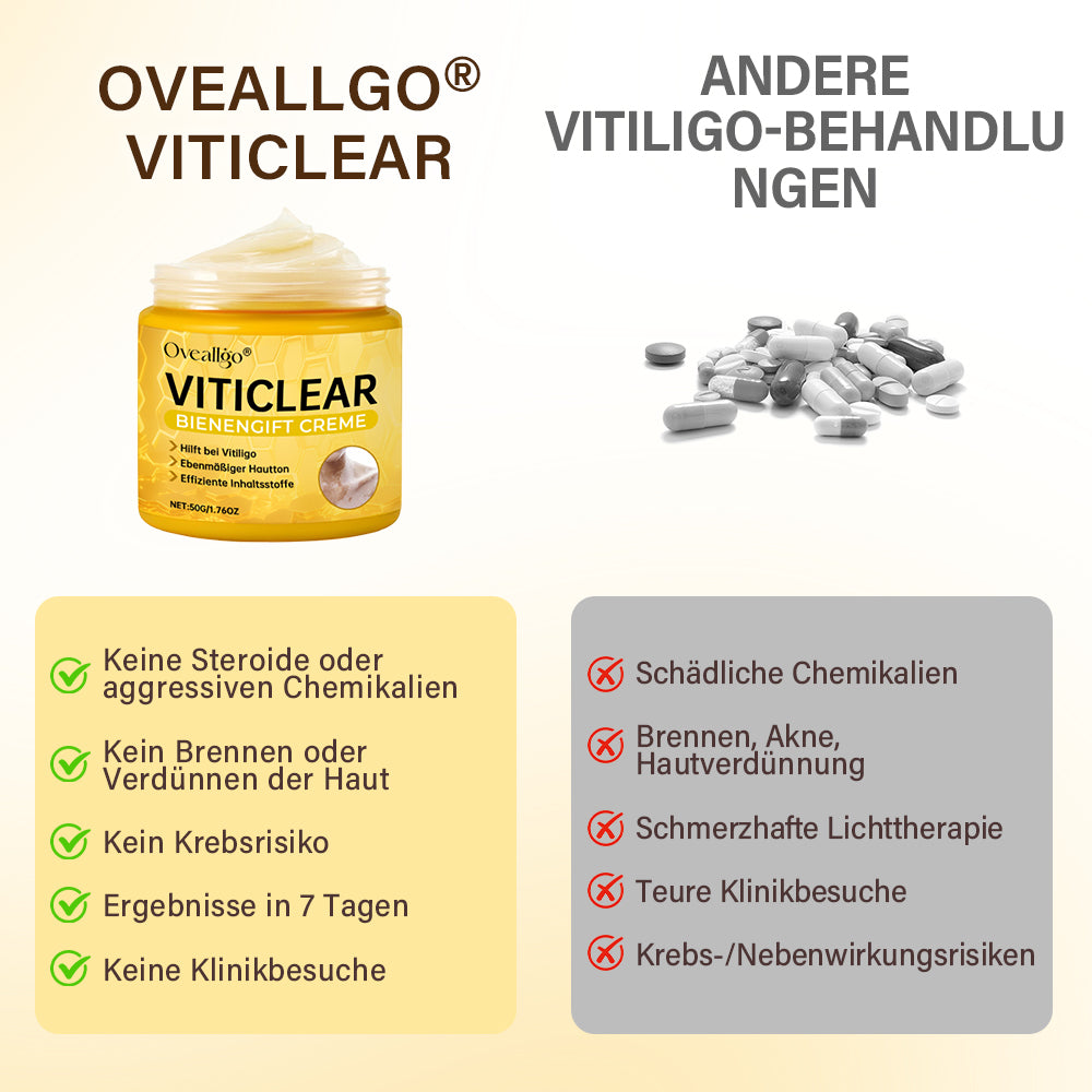 Viticlear liefert sichtbare Ergebnisse bei der Wiederherstellung der Pigmentierung durch pflanzliche Inhaltsstoffe - ohne Reizungen, scharfe Chemikalien wie Steroide oder erneute Pigmentierung, wie sie bei chemischen Behandlungen auftreten.